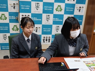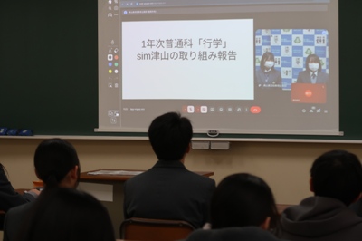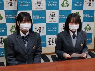 最初に普通科1年の長澤麻帆さんと鮎川明依さんが総合的な探究の時間「行学」での「SIM津山」の取組の一環として、教育分野に関して、その課題解決のために担当者の方からお話をうかがったり、小学校に出向いたりして学ばせていただいていることの現状報告をしました。