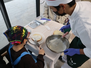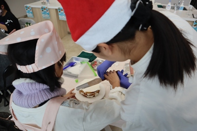 アイシングクッキーづくり: 食物調理科の生徒が先生となって、クッキーのアイシングに挑戦。小学生だけでなく、保護者も一緒になって楽しみました。