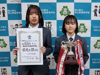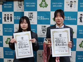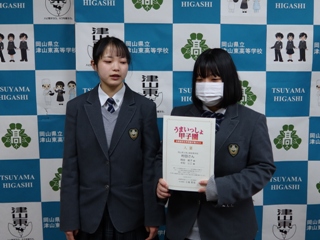 続いて、食物調理科3年の岡田結子さんと中村にこさんが「うまいっしょ甲子園」で全国の仲間と切磋琢磨した経験を話し、その経験を「就職や進学に生かしていきたい」と報告しました。