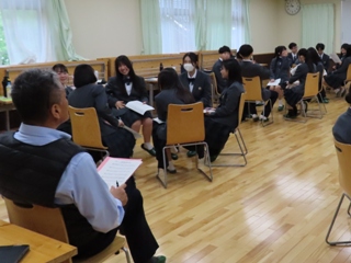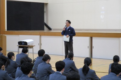 3年生に進級する2年生は自分事として、1年生は少し先にはなりますが目を輝かせて聞きました。先輩方の話を聞いた後、質疑応答があり、1・2年生とも積極的に「なぜ、その大学を選んだのか」、「就職試験の時に大変だったことは何か」、「仕事のやりがいは何か」など具体的な質問が出ました。