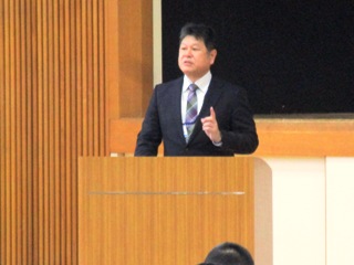 「あいさつは、コミュニケーションのはじまり。そのドアノブは内側にしか付いていないので、自分から開けないといけない。」「環境美化とは掃除をすること。掃除に集中すると、美しい心がはぐくまれ、謙虚な心が生まれる。そして、感動する心や感謝の気持ちも生まれる。」「対話のある関係づくりでは、みんな違ってみんないい、お互いの違いを認め合い、切磋琢磨していきましょう。」と話されました。