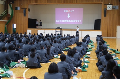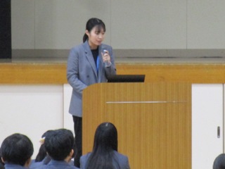 まず、生徒支援部の清水先生より車の運転など専攻科生としの「生活の心得」についてお話がありました。また、看護科長の森内先生からは、自分の目指す看護師像に向けて「学習面での取り組み」についてお話がありました。