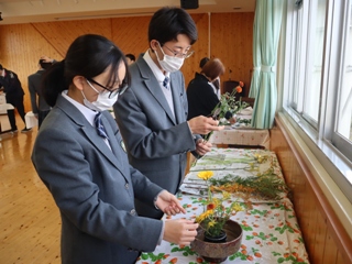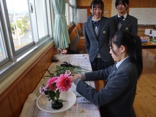 花の生け方や色の配色、見せ方など、先生方のアドバイスをいただき、テーブルを飾りました。