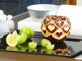 基本的なカービングナイフの使い方から飾り切りの応用を、マスカット、すだち、りんごを使って教えていただきました。
