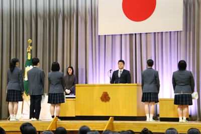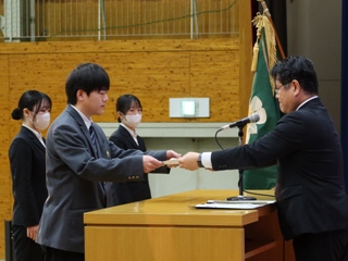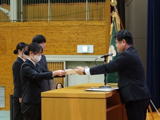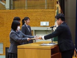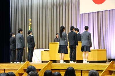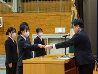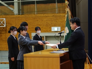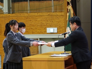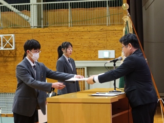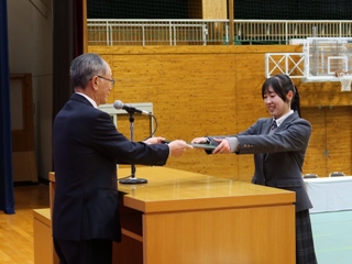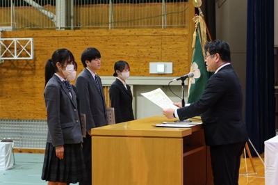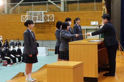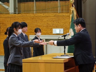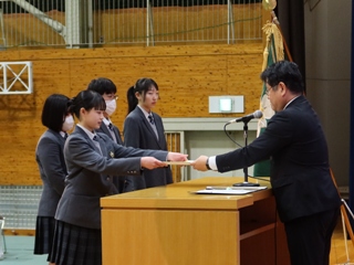 表彰式では一人ずつ壇上で山本校長から表彰状を手渡され、生徒たちに披露されました。