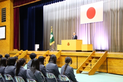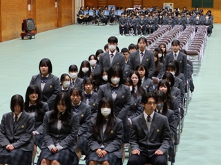 生徒たちは、寒さで体育館が冷え込むなか、メモをとりながら聞いていました。