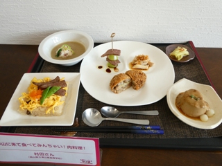 本校は3年連続の出場となり、今回は「津山に来て食べてみんちゃい!肉料理」と題して、そずり肉やよめなかせ、干し肉をはじめ県産の食材をふんだんに使用した料理を披露しました。