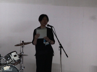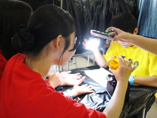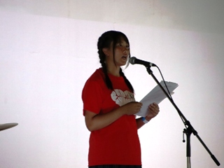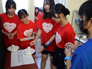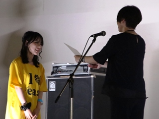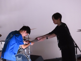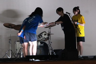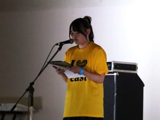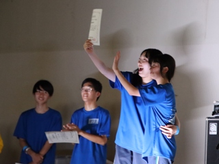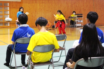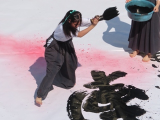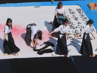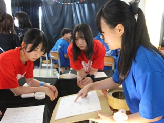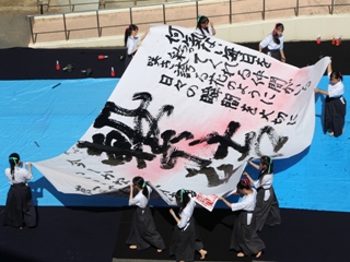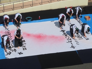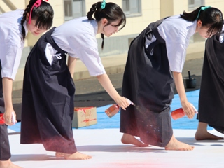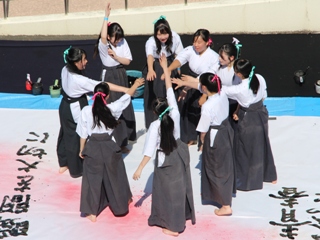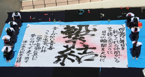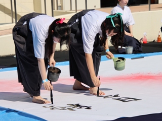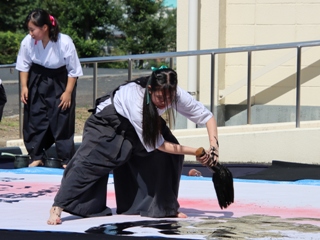書道パフォーマンスは、1年生を加えた新体制で挑みました。つながりを大切にしたいという思いが強かったので、つながりを表した「繋」と、人と人とを結ぶことを表した「結」の2文字を大字にしました。「繋結」は、存在しない言葉ですが、絆を結ぶという意味を込めて、私たちなりに表現しました。緊張しましたが、練習してきたことを発揮することができました。