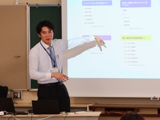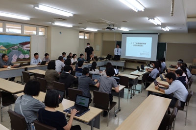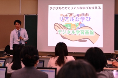研修では現在話題になっている「生成AI」をいかに活用し、生徒の学びを深化させるかについて、平松指導主事から分かりやすい講義をしてもらいました。参加した先生は、実際に端末を操作して生成AIを試してみたり、他校の実践例を紹介してもらったりして、授業で活用する方法を学びました。