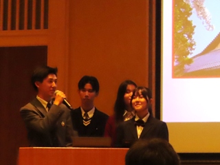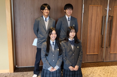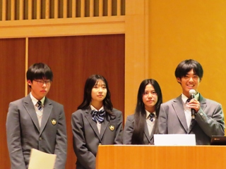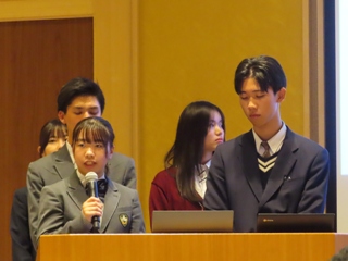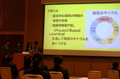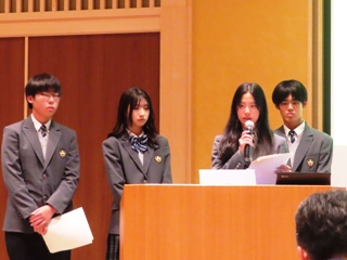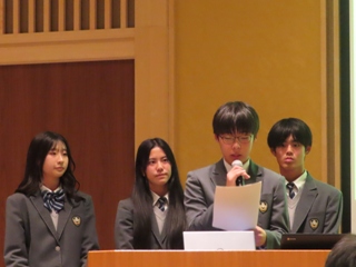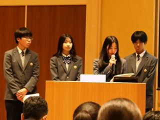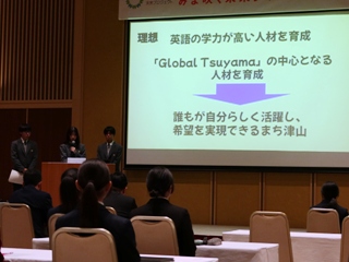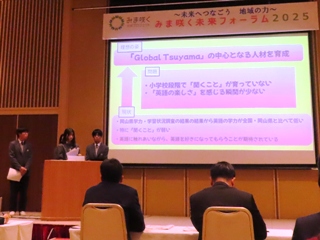 また、本校の総合的な探究の時間「行学」での取り組みについて、普通科2年生の教育分野グループより菅谷千都さん、黒瀬春菜さん、髙野優良さん、山口巧さんが「Enjoy English ~『Global Tsuyama』を支える次世代型英語教育~」というタイトルで発表しました。
