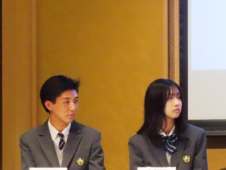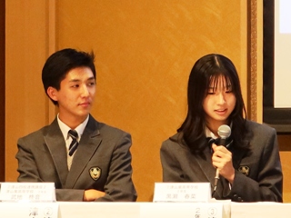 本校の黒瀬春菜さんと武地柊音さんがステージに上がり、パネルディスカッション形式でそれぞれの地域の魅力と改善していくべき点について高校生らしい視点で意見交換しました。