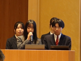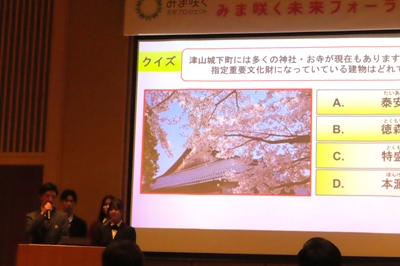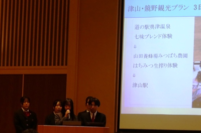 「津山地域への誘客プロジェクト」という全体テーマのもと、「台湾人観光客向けツアープラン(津山~鏡野)」、「若き語り部が案内します!城下町の記憶を歩く。」というタイトルで2つの班が発表しました。