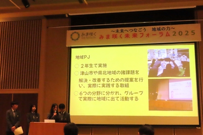 津山市内県立4校による四校連携講座「地域創生学」の活動発表では、本校から普通科2年生の紙川なぎさん、武地柊音さん、福井心絆さんが参加しました。