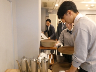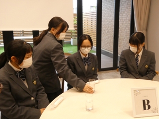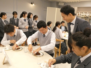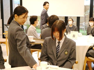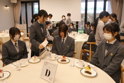 学校では事前に練習をしています。しかし、実際のケーキやコーヒー・紅茶を目の前にすると失敗してはいけない気持ちで緊張していましたが、楽しく学ぶことができたと思います。