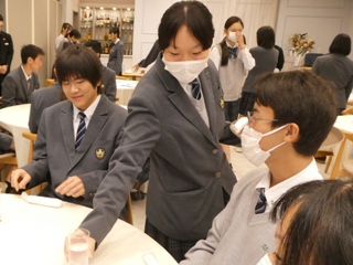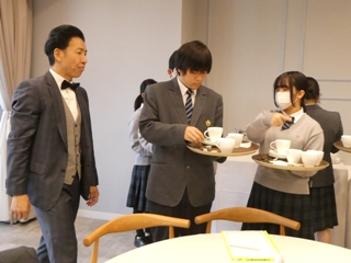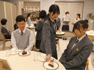 生徒たちはサービスをする側とお客様側に分かれ、注文からケーキセットを提供するまでを行いました。