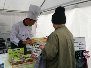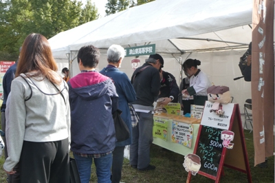 地産地消・食育コーナーにおいて、パウンドケーキ(シンプル・フルーツ) の販売を行いました。販売は午前10時と午後1時の二部制で実施し、シンプルは各回50本、フルーツは各回20本を準備しましたが、開始からわずか10分で両日とも完売となるほど大変ご好評をいただきました。