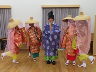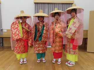 後醍醐天皇時代行列では天皇・武者・駕籠かき・貴族・女官の衣装を身に着け写真撮影をしました。あいにくの雨で町を歩くことはできませんでしたが、地域の方々が1時間近くかけて着付けをしてくださり、貴重な体験をさせていただきました。
