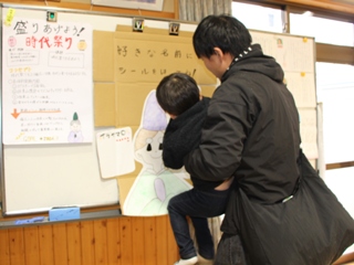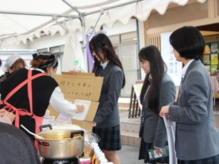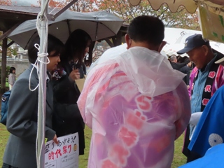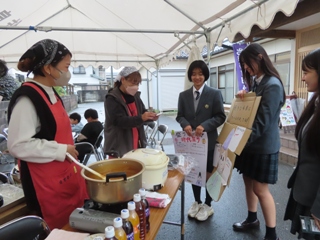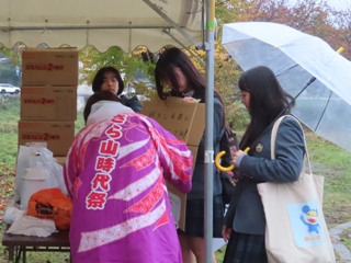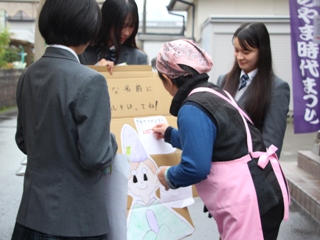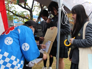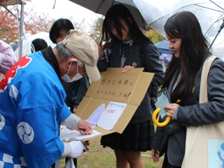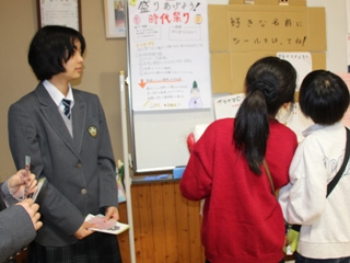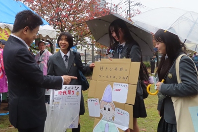 その後、本校普通科2年生の榎本せらさん、江原雅さん、定森心香さんが総合的な探究の時間「行学」での取り組みで、さら山時代祭PRのためのマスコットキャラクターを制作し、その名前を決定するために佐良山地区の方々にアンケートを実施しました。
