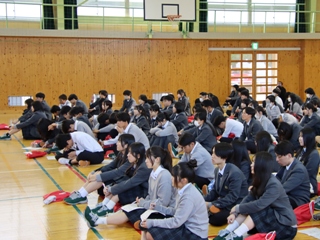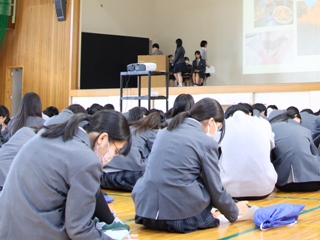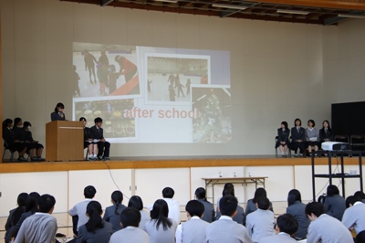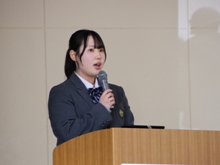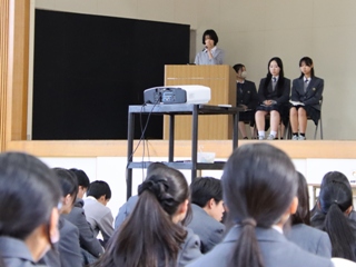 このスピーチコンテストに向けて普通科2年生が2学期の初めから準備を進めてきました。クラスごとにグループ代表を決定し、その後クラス代表を決めました。そしてその中から選ばれた学年代表7名が、普通科1・2年生に向けて、ステージ上でスピーチを行いました。