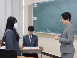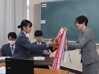 鈴木さんはこの大会で優秀賞に選ばれ、板谷教頭より家庭クラブ員の前で表彰をしていただき、披露しました。