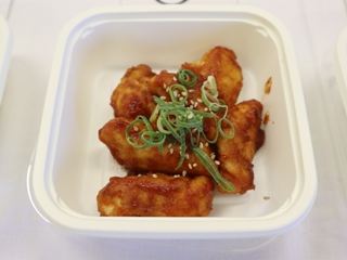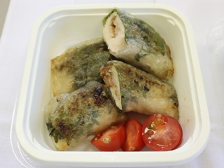 鶏ささみ:ささみに梅肉をはさんだものを大葉とライスペーパーで巻いてさっぱりさせています。