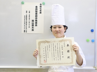 11月22日(土)に岡山ふれあいセンター(岡山市中区)で行われた令和7年度食肉惣菜創作発表会岡山県大会(岡山県食肉事業協同組合連合会主催)に、食物調理科3年生の稲田陽菜さん・大前乃依さん・久保田香奏さん・清水千賀さん・松井祐樹さんの5名が出場しました。