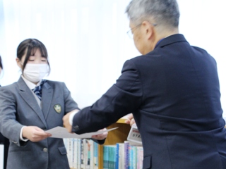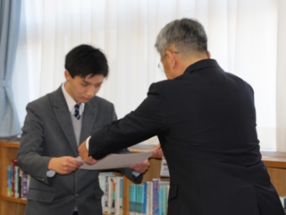 続いて、支部長による表彰がありました。受賞者は緊張した面持ちで、表彰状と副賞(図書券)を受け取りました。
