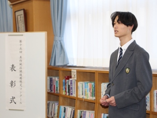 最後に、受賞者代表として、本校普通科1年鈴木優晟さんが受賞の言葉を述べました。このコンクールをきっかけに本の豊かな世界に触れることができたことへの感謝を、素直な言葉で語ってくれ、多くの共感を呼びました。生徒たちは、身の引き締まる時間を過ごすことができました。