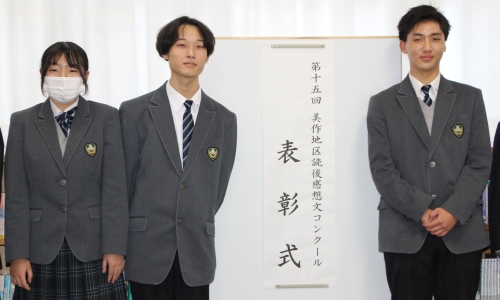 本校では、読書を通して人生を豊かにしていくために、毎年夏に、1・2年生が読書感想文に取り組んでいます。校内選考を経て、毎年、美作地区読後感想文コンクールに応募してきました。今年度は、応募した生徒のうち、3名が入賞し、表彰を受けました。