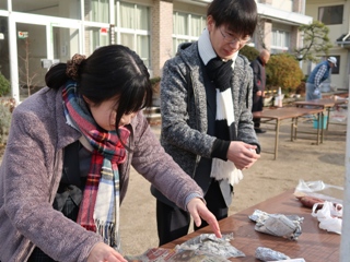 子どもたちがやってくる前に、焼き芋の準備をしました。新聞紙とアルミホイルでさつま芋を包み、もみ殻で作った窯に火を付け、煙突を立てました。その中にさつま芋を忍ばせ、焼き芋ができるまで温かく見守りました。
