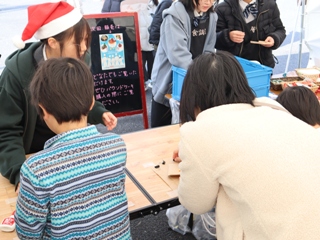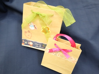 また、体験コーナーとして、コピー用紙の包み紙を再利用したペーパーバック作りも行い、クリスマスの飾り付けをして楽しんでもらいました。