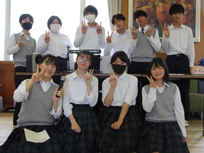 みなさん、こんにちは。報道部です。私たち報道部は、特に、水曜日のお昼の放送に力を入れています。そこでは、リクエスト曲やアンケート曲など、みんなの好きな音楽を流しています。部員同士の仲が良く、みんなで楽しく、お昼の放送の内容や曲を決めています。私たちと一緒に学校生活をenjoyしたい方は、ぜひ、報道部へwelcome~!