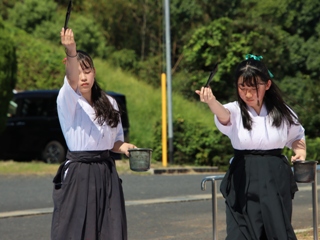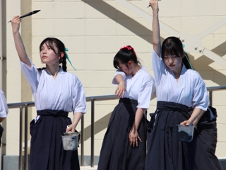 2日目の書道パフォーマンスは、1年生を加えた新体制で挑みました。つながりを大切にしたいという思いが強かったので、つながりを表した「繋」と、人と人とを結ぶことを表した「結」の2文字を大字にしました。「繋結」は、存在しない言葉ですが、絆を結ぶという意味を込めて、私たちなりに表現しました。緊張しましたが、練習してきたことを発揮することができました。