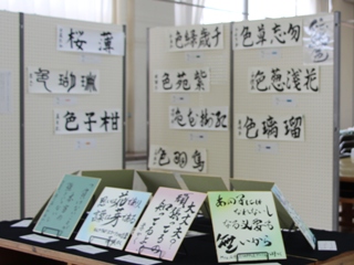 1日目の作品展示は、「伝統色×名言」をテーマに制作した作品を展示しました。また、うちわに好きな文字を書く体験コーナーも行いました。楽しそうにうちわや半紙に文字を書かれている姿が印象的でした。